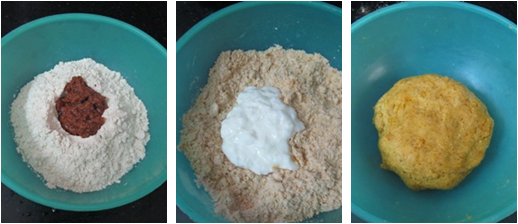 - Place wheat flour in a mixing bowl add mango pickle and mix well, then add in curd, little salt, enough water and make a soft dough, keep aside for 15 mins with cover.