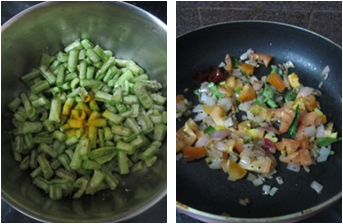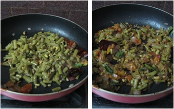 1. The bobbara chikkudukayalu were long, thin and dark green. Wash green long beans and cut into small piece. Cook along with turmeric powder, enough salt and strain, heat oil in a pan add popu ingredients and fry.