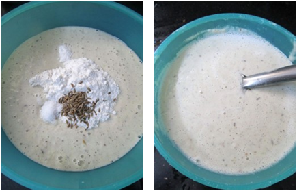 Transfer to a mixing bowl and add rice flour, salt, cumin seeds and mix well. If needed add more water and mix well like dosa batter.