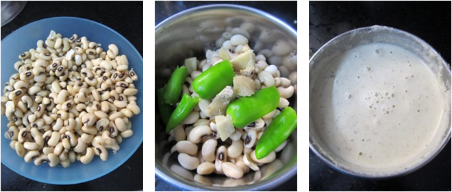 Wash and soak alasandalu/black eyed peas in water for 6-7 hours or overnight. Next day wash and drain them. Add ginger, green chillies to it and grind into paste adding enough water.