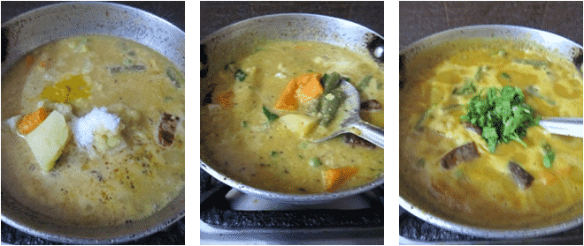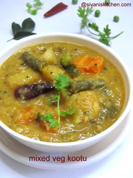 Add 1/2 cup of water, enough salt, turmeric powder and mix well, continue to cook for a couple of mins. Finally add chopped coriander leaves and stir well. Now spicy and tasty mixed veg kootu is ready, transfer into a serving bowl and serve hot with rice or roti.