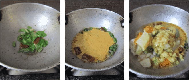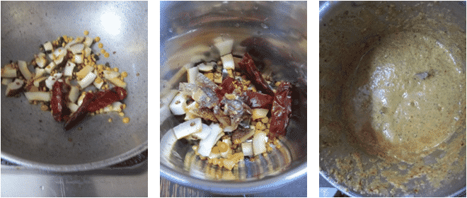 In the mean time, heat 1/2 sp oil in a pan add above paste ingredients and fry, then add coconut pieces and fry for a while (tamarind flake), remove from the flame and allow it to cool. Once cooled, grind them into paste with tamarind and adding enough water.