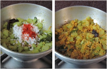 - Then add chow chow pieces, salt, turmeric powder and mix well, cover and cook for 5 mins, stirring occasionally, if needed add little water.