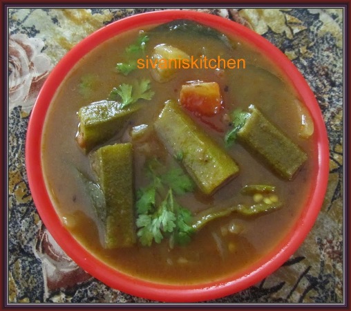 - Add rice flour with little water and pour into the stew and stir well, simmer for 2-3 mins and turn of the heat. Now Bendakaya mukkala pulusu is ready, transfer into a serving bowl.