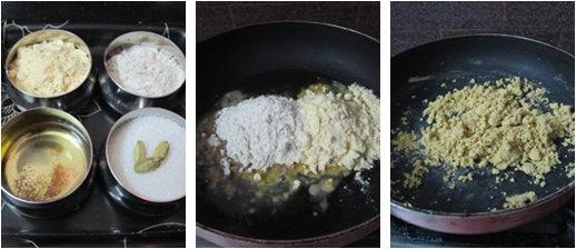 1. Heat ghee in a khadai, when hot add the besan, wheat flour and fry- stirring continuously on low heat till it gives good aroma & turns light brown color. Then remove from the pan to a mixing bowl and allow it cool slightly.