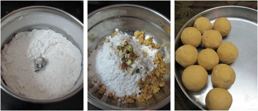 3. Take some amount of the besan wheat mixture and make into small lemon sized balls and set aside to cool, now besan wheat laddus are ready to offer as naivedyam to Varalakshmi Vratham.