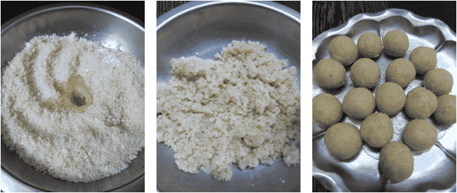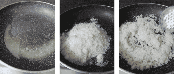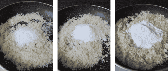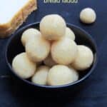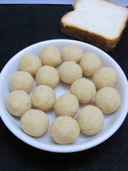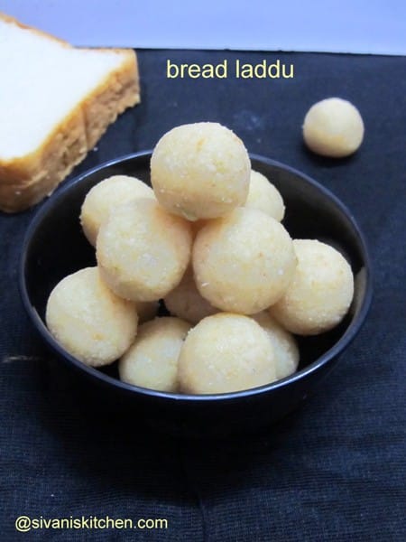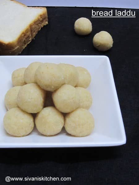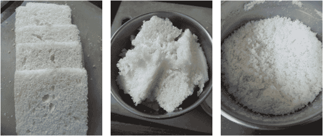 Trim the edges of the bread slices and tear them into small pieces, then blend the bread pieces into powder. Heat 2 sp ghee, when hot add bread powder and fry for a couple of mins on low flame. Add desiccated coconut and fry for 30 secs, then add in milk powder and stir-fry for a couple of mins, finally add sugar powder and mix well. After that remove from the heat and transfer to a mixing bowl. Add remaining warm ghee and mix thoroughly with hand, then roll the bread mixture into laddus. Now tasty and delicious bread laddus are ready to serve.
