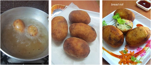 - Remove from the pan & place on a paper towel to absorb excess oil, now bread rolls(with leftover pongal)are ready, serve hot with chutney or sauce.