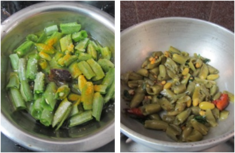 - Wash and pressure cook chopped broad beans with enough salt, tamarind flake and turmeric powder, once done strain them & keep aside. Heat oil in a pan add popu ingredients and fry, then add curry leaves, cooked broad beans and stir-fry for a min with low-medium flame.