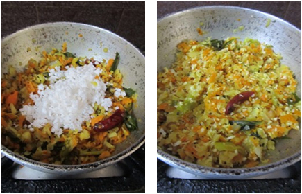 - Once done add grated coconut and mix everything well and cook for a while, now cabbage carrot mixed curry is ready, transfer into a serving bowl and serve with rice and roti.