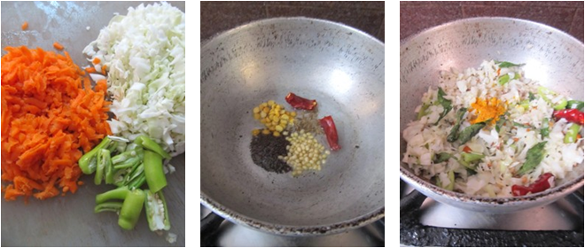 - Heat oil in a pan add popu ingredients and fry. Once done add curry leaves, green chillies and fry for a while. Then add in chopped cabbage and mix well, add turmeric powder and stir. Sprinkle little water and cook on medium flame with a lid. keep stirring in between.