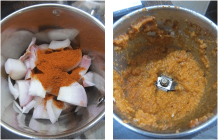 - In the meantime grind chopped onion, red chilli powder into a course paste and keep aside