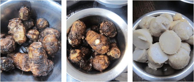 - Wash and cook chamadumpalu and let it cool for a few mins. Once done remove the skin and chop them into cubes and keep aside.