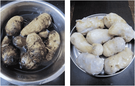 - Wash and pressure cook chamadumpalu for 2 whistles and keep aside for cool. Once done drain the water and remove the skin and keep aside.