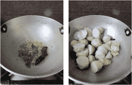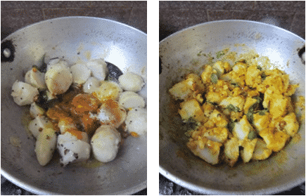 - Heat oil in a pan add popu ingredients and fry, when done add curry leaves and fry for a sec. Then add chopped taro root.
