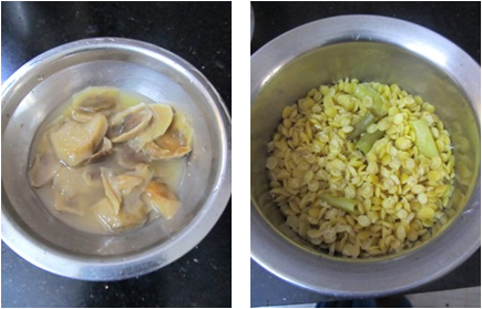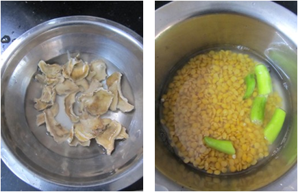 - Wash and soak the sun dried mango pieces in a bowl and keep aside. Wash the toor dal, green chillies and place in a bowl.