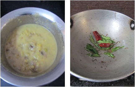 - Mash the cooked mango pieces and add it to the cooked dal and mix thoroughly. Heat oil in a pan add popu ingredients and fry, once done add curry leaves.