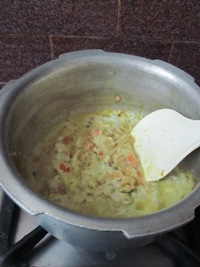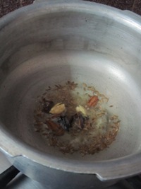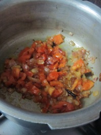 - Heat oil in a pan add cumin seeds, hing, cinnamon, elaichi, cloves and fry for 30 secs, add onions and fry, when done add chopped tomatoes and fry until soft.
