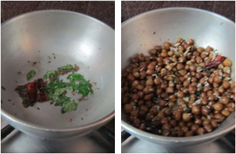 Heat oil in a pan add popu ingredients and fry, once done add cooked chickpeas, salt and fry for 30 secs, then add grated coconut and stir-fry for 30 secs.