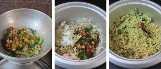 2. Heat oil in a pan add popu ingredients and fry, once done add chopped green chillies, curry leaves and stir for a while, add turmeric powder and stir, turn off the flame and add the fried popu to cooked kodo millet rice, add salt, lemon juice and mix thoroughly. Now kodo millet/arikalu lemon bath is ready, transfer into a serving bowl and serve.