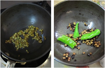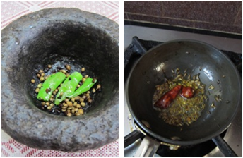 - Heat 1/2 sp oil in a small frying pan add coriander, methi seeds and fry until they become brown in color, now add green chilli and fry for 10 secs, then turn off the flame and allow it to cool.