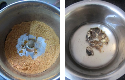 - Once cooled grind into a coarse powder. Wash and soak tamarind in a cup of water and keep aside