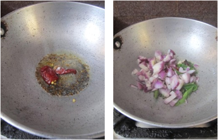 - Heat oil to the same pan add popu ingredients and fry, when it splutter add curry leaves, sliced onion and stir-fry for 1 min on low-medium flame until tender.