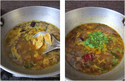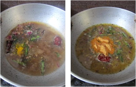 - Then add tamarind juice, turmeric powder, salt to fried onion and cook for 5 mins. Now add 2 sp ground powder and boil.