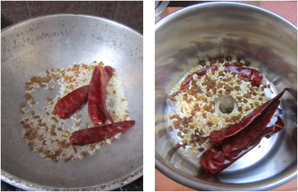 - Heat a pan add methi seeds, rice, red chillies and dry roast them till they turn light brown color. Take them out to cool.