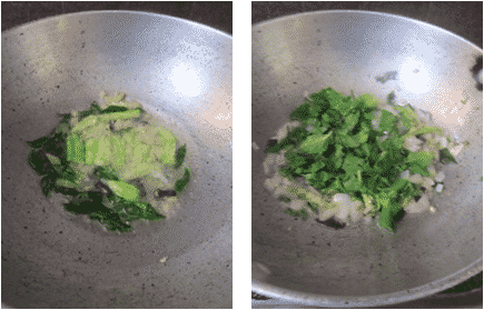 - Heat oil in a pan add cloves, cinnamon pieces and fry for a while, add chopped green chillies, ginger, curry leaves and stir-fry for 30 secs. Then add chopped onion and fry until they become soft, now add in chopped coriander, mint leaves and stir.