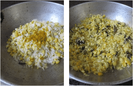 - Add soaked rice and dal mixture, turmeric powder and mix very well. Fry them on low-medium flame for 1 min and turn off the flame.