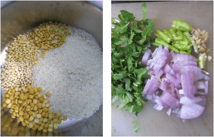 - Wash and soak rice and lentils in a bowl for at least 15 mins and keep aside, In the mean time chop the onion, ginger and green chillies.