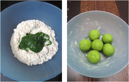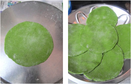 In a mixing bowl place wheat flour, enough salt, ground palak paste and mix well. Make a soft dough with enough water and keep aside with cover for 20 mins. After that knead well and divide into small lemon sized balls.