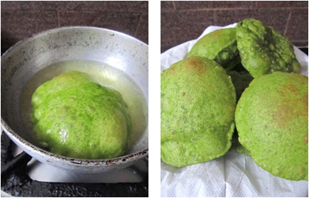 Meanwhile, heat oil in a khadai when it is hot, deep fry the raw puri on both sides until done. Cook one at a time in hot oil, then remove from the hot oil and place on a paper towel to drain excess oil, do the same with the remaining raw puris.