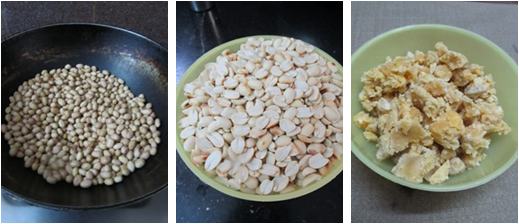 - Heat a pan add peanuts and dry roast till they become light brown in color, remove from the pan and let it cool for a couple of mins. Remove the skin by rubbing them , split the peanuts in half and keep side.