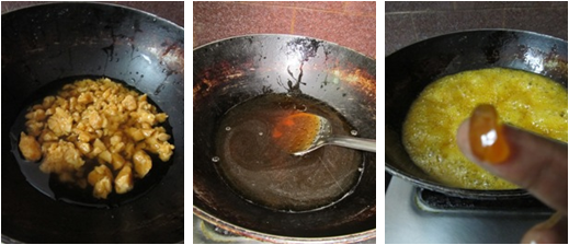 - Add jaggery in a large pan with 1/2 cup of water and bring it to a boil, the jaggery dissolves completely then strain it. Again boil the jaggery syrup till it forms a thick consistency like a ball. Pour few drops of the syrup into water to check the syrup consistency, if it becomes hard then the consistency is correct.