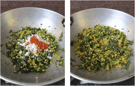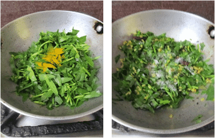 Then add in amaranth leaves/ponnaganti aaku, turmeric powder and stir – cook for a while. Add enough salt and cook with a lid, stirring occasionally.