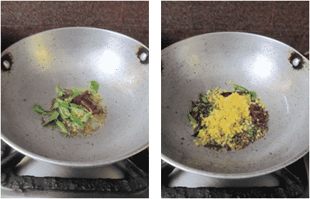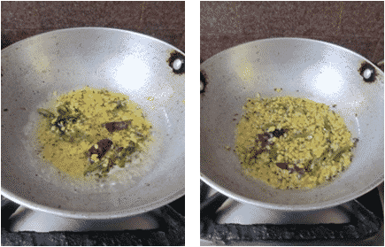 Wash and soak the moong dal in water for 10 to15 mins. After that heat oil in a pan add popu ingredients and fry. Once done add curry leaves and stir. Then add soaked moong dal and stir.