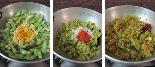- Heat oil in a pan add popu ingredients and fry, once done add crushed garlic, curry leaves and fry for a few secs, then add chopped snake gourd pieces and stir. Sprinkle little water and cook with cover until half done.