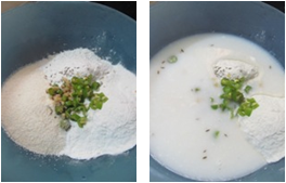- In a mixing bowl combine above all ingredients (except oil) mix together and prepare a thin batter with enough water and keep aside for 10 mins.