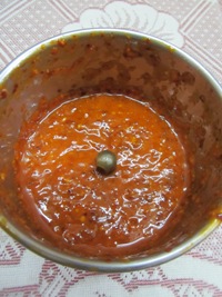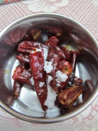 - Take a mixie jar and add red chillies, enough salt and grind into a coarse paste with 1/4 cup of water.