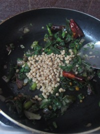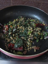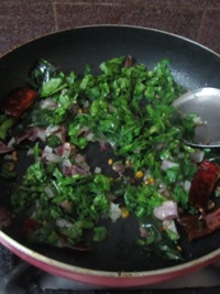 - Heat oil in pan add popu ingredients and fry, once done add curry leaves, chopped spinach and mix well.