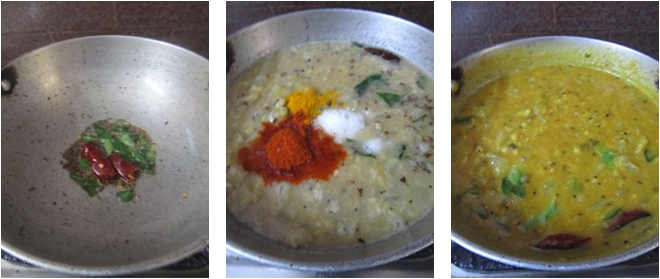 2. Heat oil in a pan add popu ingredients and fry, once done add curry leaves, cooked dal mixture and stir well. Now add salt, turmeric powder, red chilli powder and mix well.