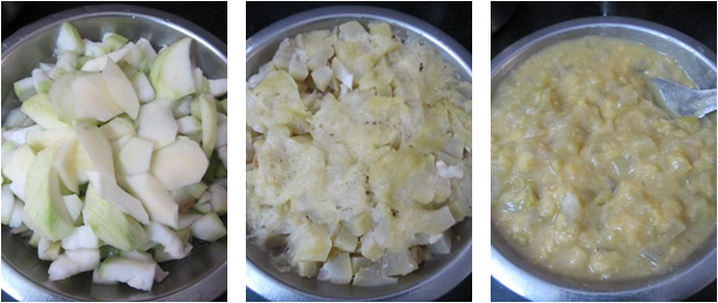 1. Combine bottle gourd, mango, green chillie pieces, toor dal and pressure cook for 4 whistles. Allow it cool, once cooled remove the lid and mash well.
