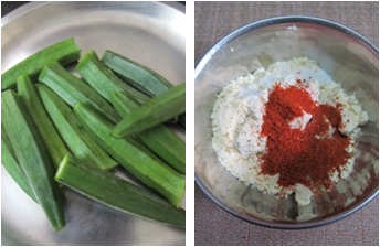 - Wash and pat dry bendakayalu and trim the head and tail, then slit lengthwise & apply little salt and keep aside.