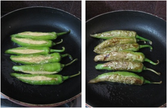- Wash and pat dry the green chillies and slit lengthwise on one side and remove the seeds.