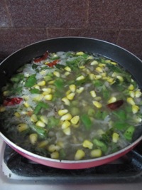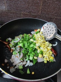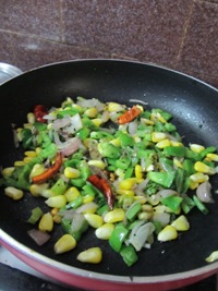 - Cook till the onions are tender add sweet corn, chopped capsicum and stir, cook for 2 mins on low - medium heat with cover.