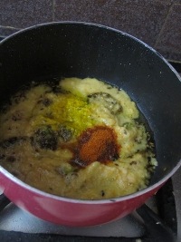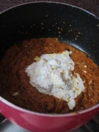 4. Add ground tomato paste, red chilli powder, turmeric powder and stir well, cook for a couple of mins, next add ground coconut paste and cook.