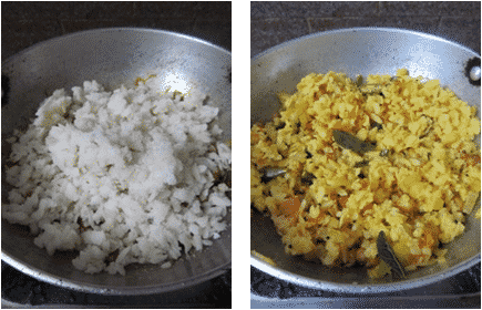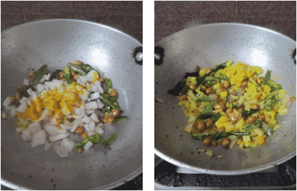 - Once done add chopped onion, turmeric powder, little salt and stir-fry until the onions are soft, stirring frequently.
