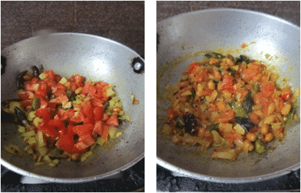 - Then add in chopped tomatoes and stir, cover and cook on low flame, until the tomatoes turn soft and mushy.